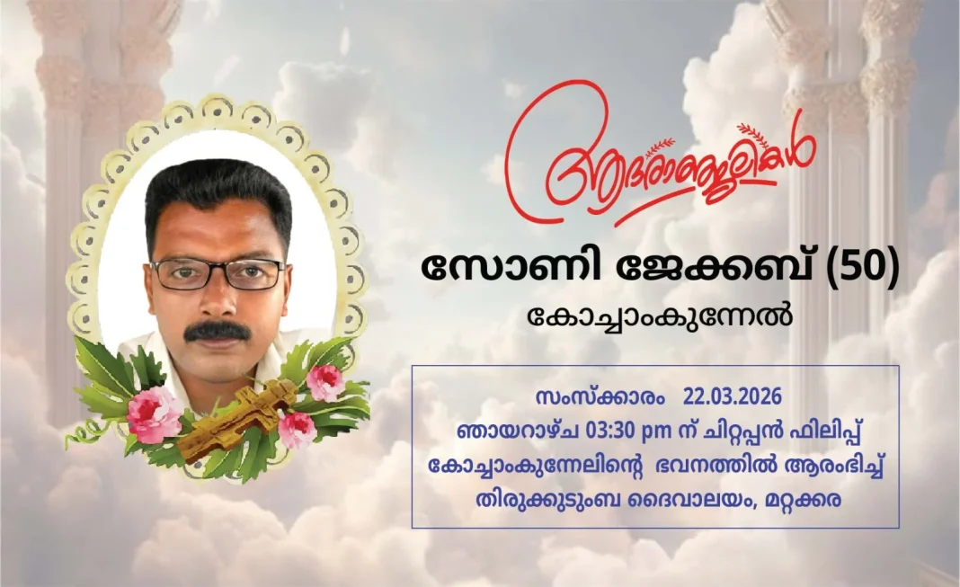 മറ്റക്കര തിരുക്കുടുംബ ദൈവാലയ ഇടവകാംഗമായ സോണി ജേക്കബ് കോച്ചാംകുന്നേൽ (50 വയസ്സ്) നിര്യാതനായി.